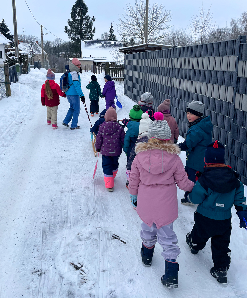 In den letzten Wochen verwandelte sich die Natur in eine zauberhafte Winterlandschaft! Der Schnee lockte uns Kinder nach draußen. Dort bauten wir einen großen Schneemann, rutschten den Berg herunter und hatten viel Spaß bei einer Schneeballschlacht. Ein besonderer Höhepunkt war für uns der Besuch im Theater!
